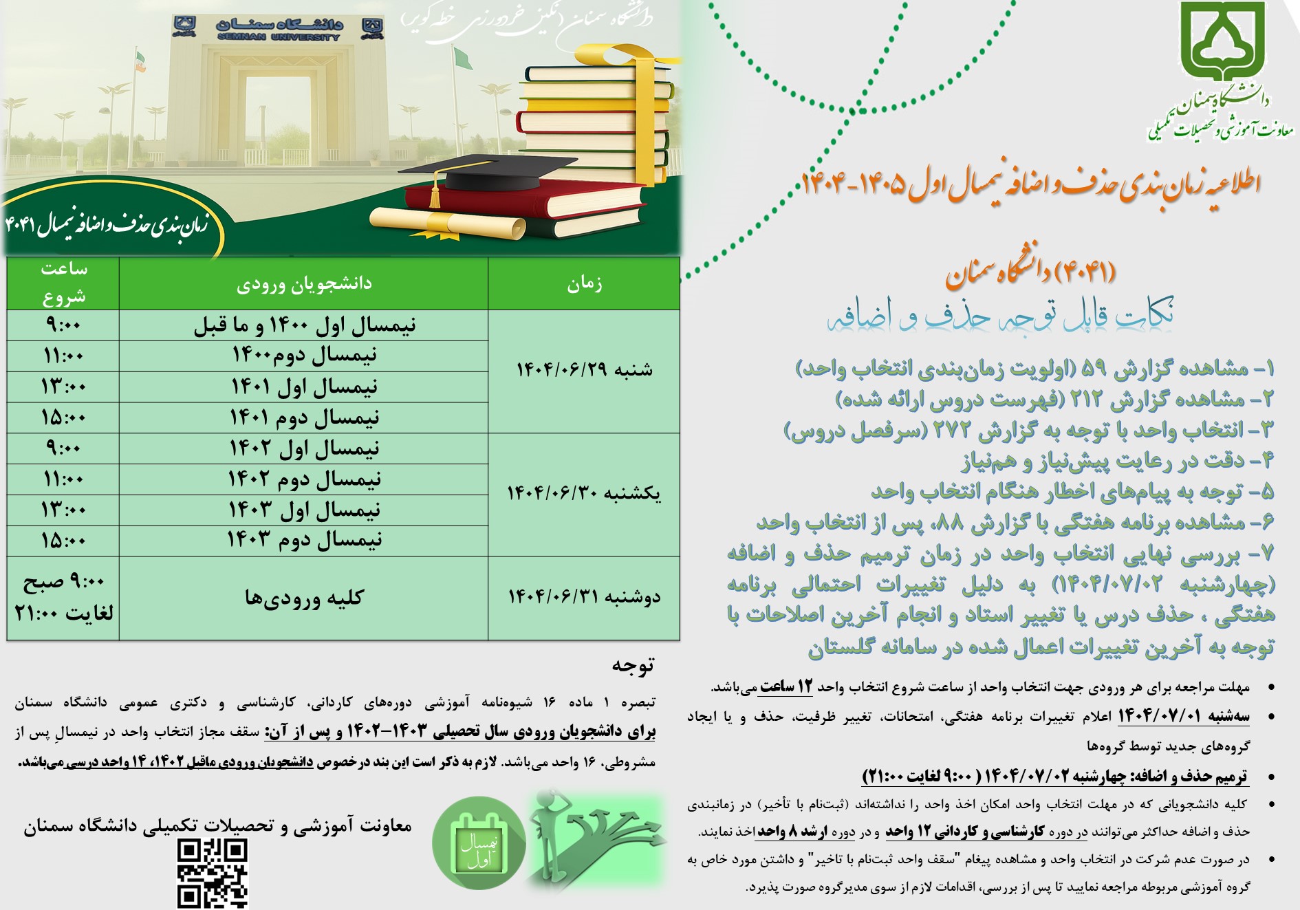 اطلاعیه زمانبندی حذف و اضافه نیمسال 4041 1404/06/29 - 08:50 تعداد بازدید: 380 اطلاعیه زمانبندی حذف و اضافه نیمسال 4041 کلمات کلیدی