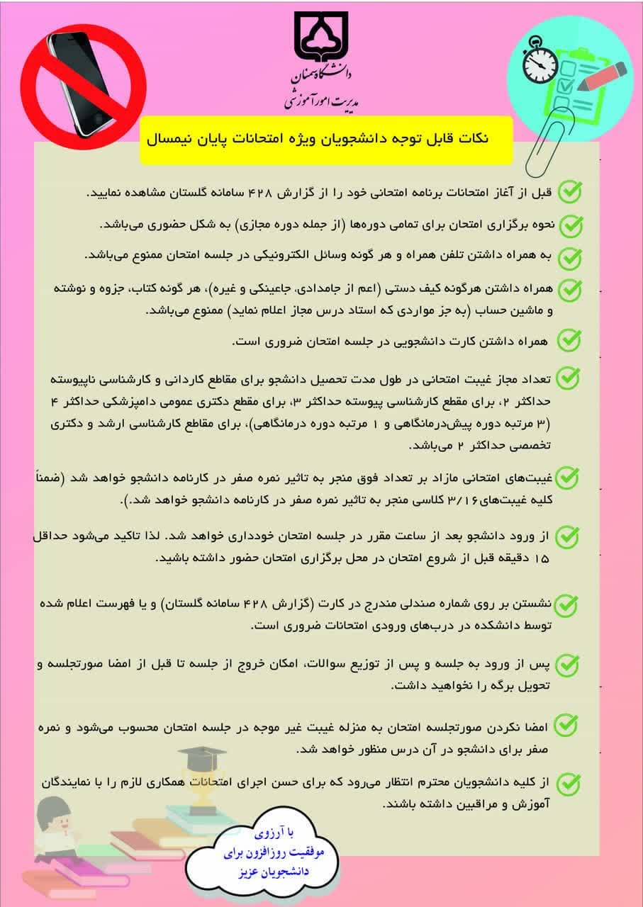 نکات قابل توجه در امتحانات پایان ترم 1404/03/11 - 08:20 تعداد بازدید: 475 نکات قابل توجه در امتحانات پایان ترم کلمات کلیدی