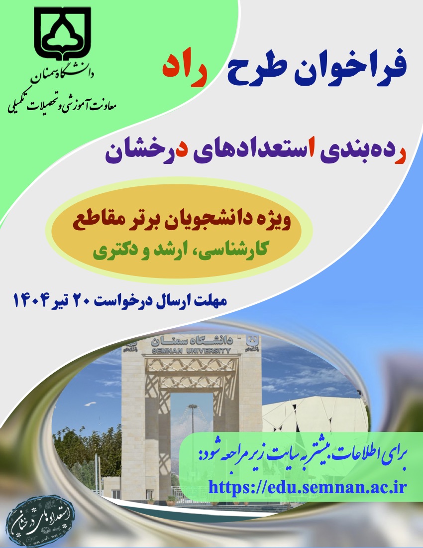 گروه هدایت استعدادهای درخشان دانشگاه سمنان در راستای شکوفایی و ایجاد نشاط علمی و نیز شناسایی، حمایت و پرورش دانشجویان ممتاز، اقدام به تدوین طرح راد کرده است. در قالب این طرح دانشجویان ممتاز با توجه به فعالیت­‌های آموزشی و پژوهشی خود در سه رده قرار گرفته و مشمول تسهیلات اعطایی دانشگاه می­‌شوند. برای شرکت در این طرح، متقاضیان باید کاربرگ پیوست را تکمیل کرده و به همراه مستندات لازم حداکثر تا تاریخ 20/4/1404 به دانشکده مربوطه ایمیل نمایند. برای دریافت آدرس ایمیل دانشکده‌ها به فهرست پیوست مراجعه شود. ضمنا عبارت "طرح راد" در عنوان ایمیل درج شود. فهرست نهایی افراد برگزیده براساس امتیازبندی مورد تایید شورای هدایت استعدادهای درخشان دانشگاه توسط دفتر استعدادهای درخشان اعلام می­‌شود.