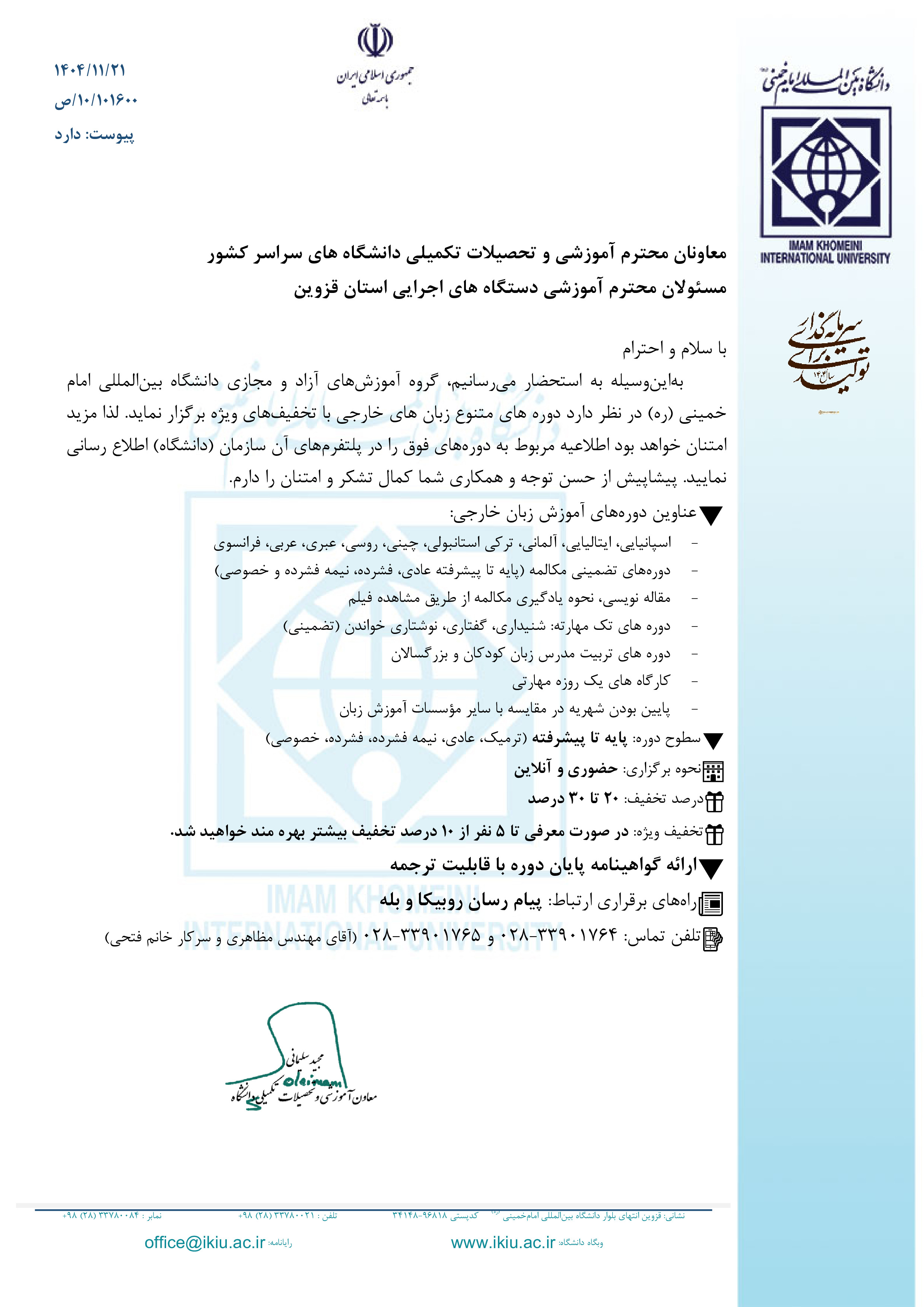 برگزاری دوره های آموزش زبان خارجی پایه تا پیشرفته 1404/11/26 - 11:30 تعداد بازدید: 15 برگزاری دوره های آموزش زبان خارجی پایه تا پیشرفته کلمات کلیدی