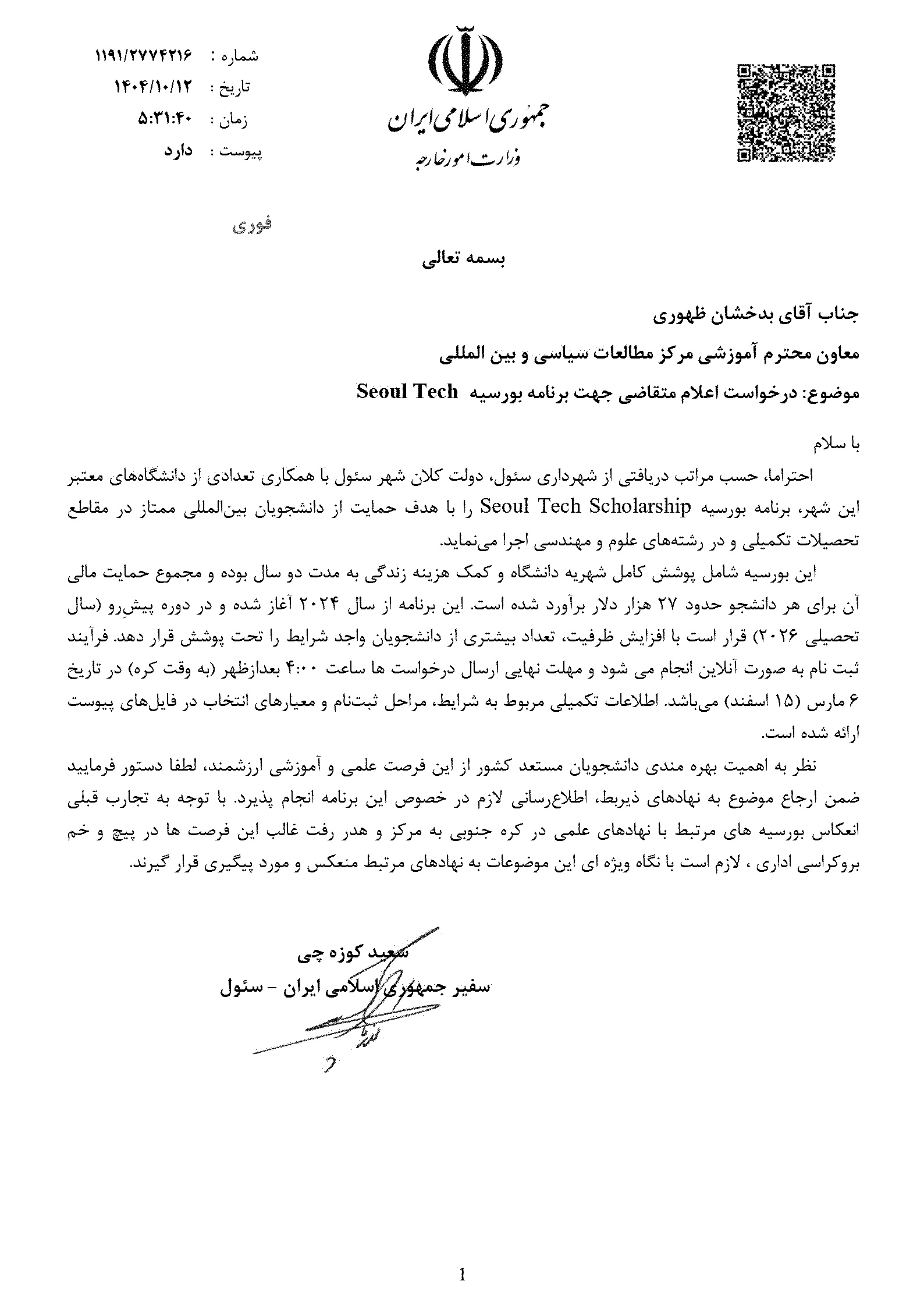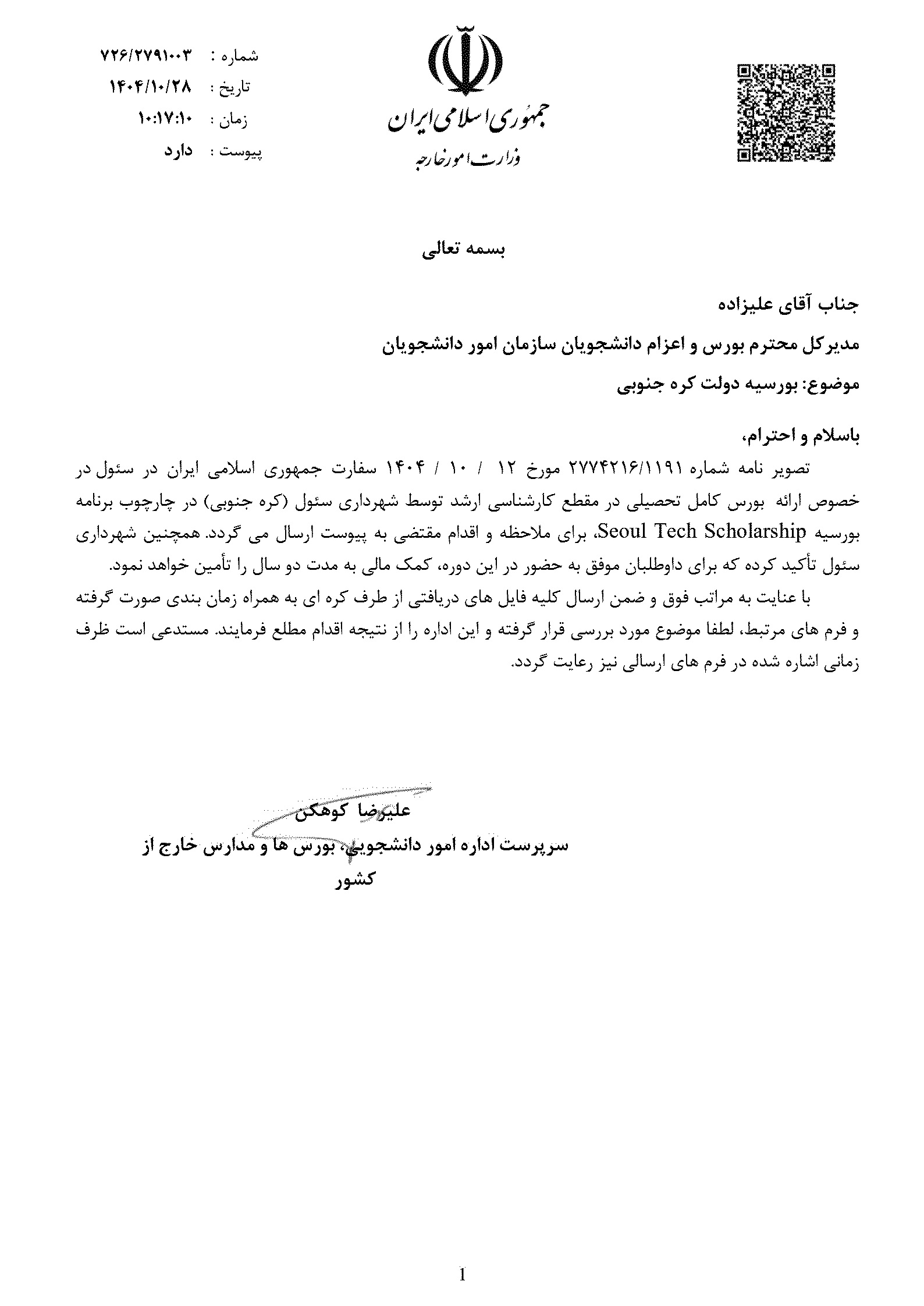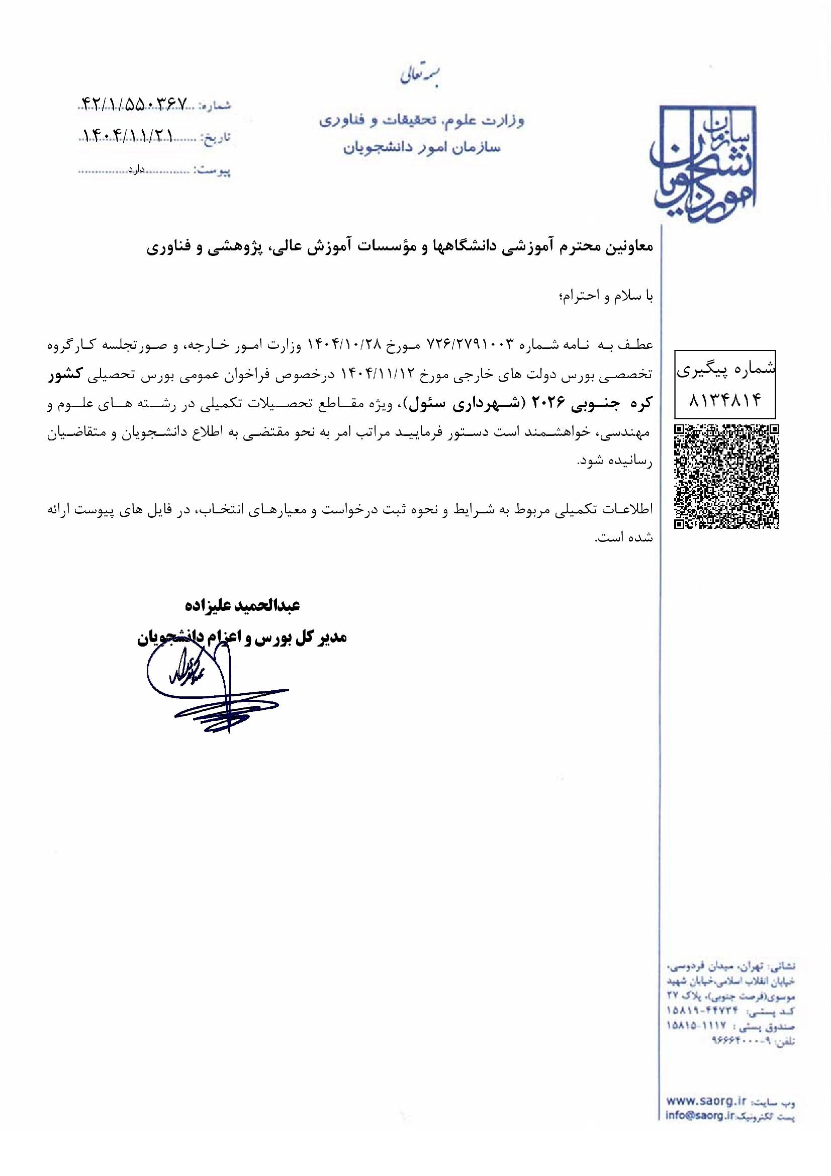 فراخوان بورس تحصیلی کشور کره جنوبی 1404/11/26 - 10:31 تعداد بازدید: 21 فراخوان بورس تحصیلی کشور کره جنوبی کلمات کلیدی