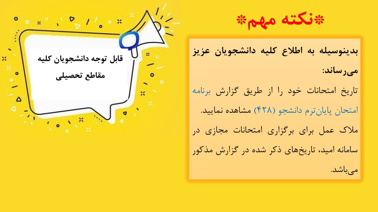 نکته مهم درخصوص مشاهده تاریخ امتحانات 1404/03/26 - 13:30 تعداد بازدید: 481 نکته مهم درخصوص مشاهده تاریخ امتحانات کلمات کلیدی